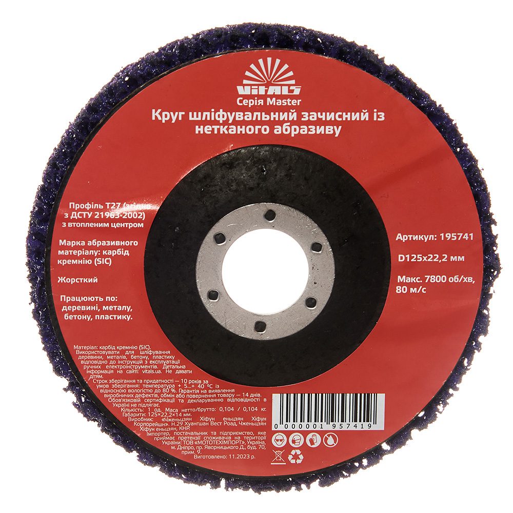 Круг зачисний з нетканого абразиву (корал) Vitals Master Т27 125×22,2 мм чорний м’який – це круг для зачищення і полірування різних поверхонь за допомогою КШМ. Круг призначений для видалення іржі, очищення зварювальних швів, видалення зварювальної окалини та застарілої фарби. Працює з різними матеріалами: нержавійною сталлю, чорними, кольоровими металами, скловолокном, бетоном, каменем, деревиною та пластиком. Має відкриту (пористу) структуру, що забезпечує високий ресурс роботи, запобігає перегріву металу. Круги мають кілька варіантів жорсткостей, відрізняючись кольором. Чорний круг – найм’якший та найделікатніший варіант. Ідеальний для видалення фарби із алюмінію, нержавійної сталі, кольорових металів.