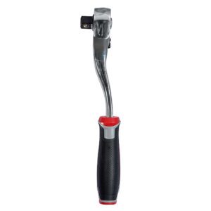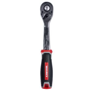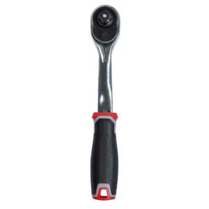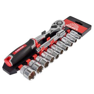 Основу комплекту складає тріскачка на 1/2″ з перемикачем напрямку та кнопкою для скидання та фіксації головок. Вигнуте руків’я дозволяє працювати з незручно розташованими кріпленнями.