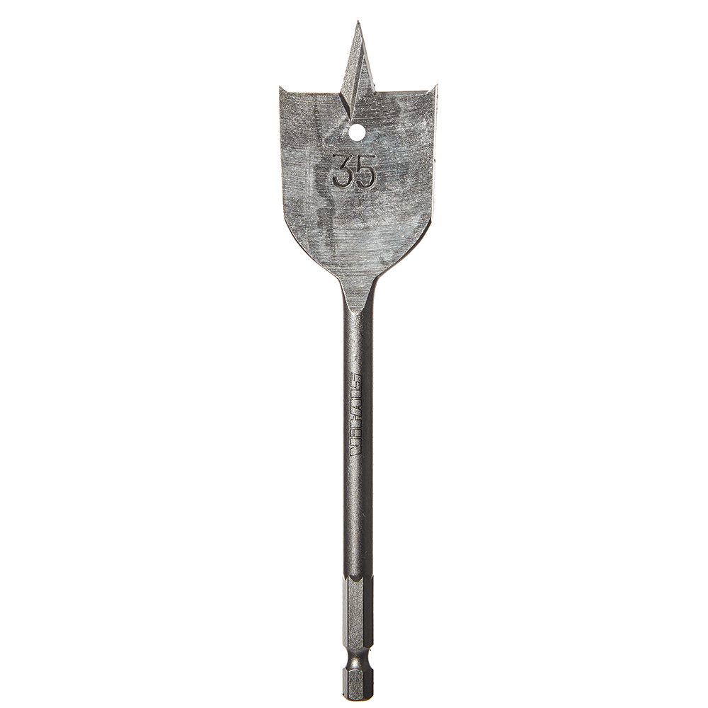 Свердло по дереву пір’яне 35 мм Vitals Master – це високоякісне свердло для свердління отворів у різних дерев’яних матеріалах. Свердло виготовлене зі сталі 45, яка має високу міцність і зносостійкість. Твердість свердла становить 45-49 HRC, що гарантує тривалий термін служби та надійну роботу. Довжина свердла становить 150 мм, що дозволяє свердлити отвори достатньої глибини. Свердло має шестигранний хвостовик (HEX), який запобігає провертанню в свердлильному патроні та забезпечує зручне захоплення. Також є цифрове маркування, яке вказує діаметр свердла в міліметрах, вимірюється по ширині лопатки. У свердла є центруючий робочий наконечник, який служить для центрування свердла та його початкового заглиблення у матеріал. Дві пари ріжучих кромок торцевої та бічної робочих частин служать для основного свердління отвору. Свердло по дереву пір’яне підходить для роботи з електричними та акумуляторними дрилями. Свердло по дереву пір’яне – це ідеальний інструмент для деревообробки та меблевого виробництва.